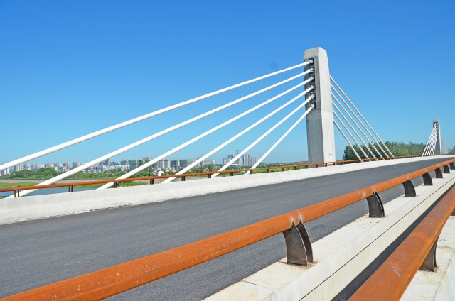 建平大道接壤苏浙,是贯通我县南北的大动脉。自建平大道开工建设以来,社会各界广泛关注。近日,记者在建平大道四期工程建设现场看到,一座现代化的长桥横跨新郎川河,映衬着好山好水,几名工人正在卸载护栏。沿着道路向南,几台大型压路机正在进行沥青铺设,工程现场呈现出一派热火朝天的建设景象。
