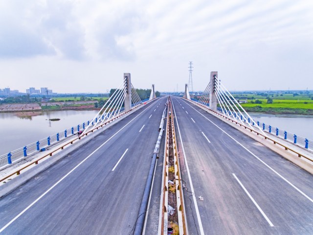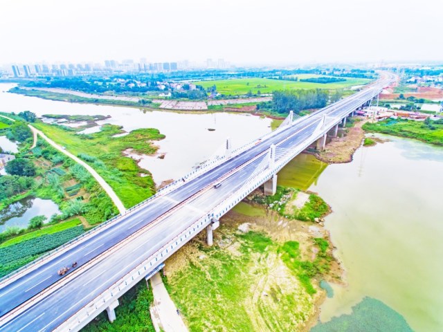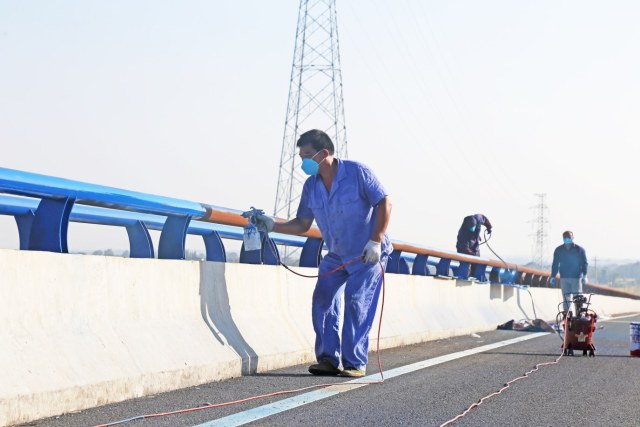 在老郎川河桥上,施工队正在为桥栏喷漆,完成最后一部分附属工程。连日来,雨水天气较多,施工队仍然风雨无阻地为道路安装公路标识,力争早日完工。放眼望去,周道如砥的柏油马路延伸开来,新老郎川河大桥雄跨两岸,气势恢宏,建平大道四期工程,是连接县城至十字的重要枢纽,是拉动两个经济开发区资源互通的重要通道,是带动我县经济社会又好又快发展的基础建设项目。